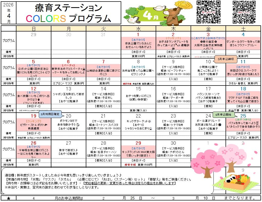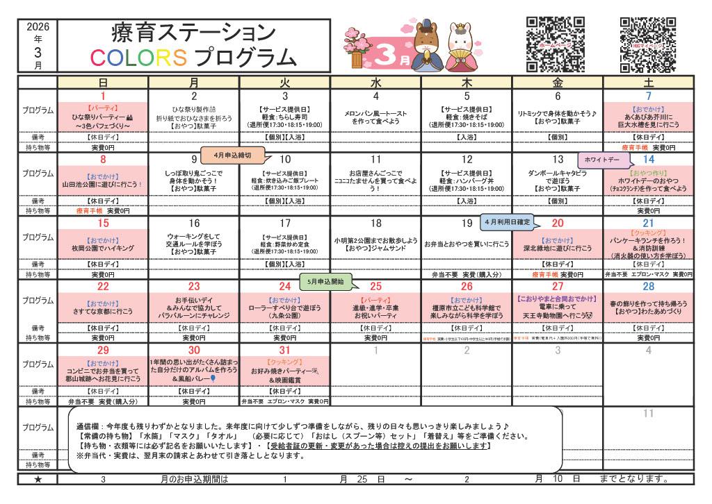 プログラム 外出やクッキングなど、一日を通して楽しめるようなプログラムを準備しています |